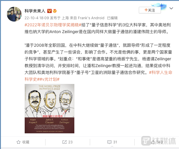 当然,有网友还分享了潘建伟和塞林格师生之间的一段小花絮。在1957年诺贝尔物理学奖获得者杨振宁的斡旋下,促成中科大团队和奥地利科学院基于“墨子号”卫星的洲际量子通信合作研究,成果入选美国物理学会评选的2018年度国际物理学十大进展。