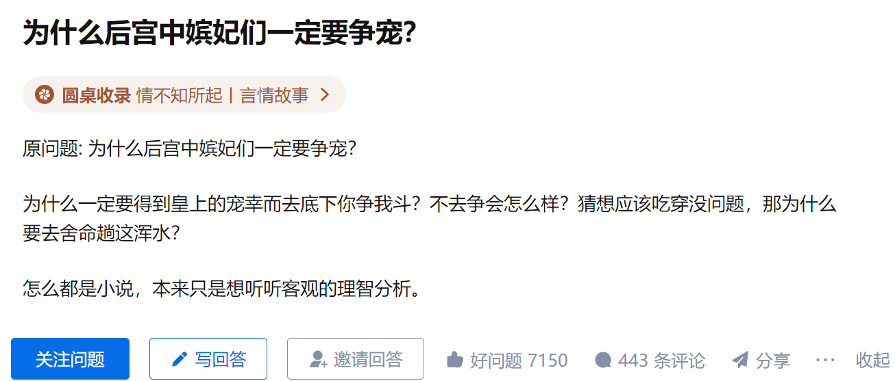 与《宫墙柳》情况相似的,还有《洗铅华》《行止晚》,这三篇小说被网友称作“知乎三大虐文”,火到已有影视公司购买其版权进行拍摄。这也为知乎打开了运营思路。2019年底知乎推出故事大赛,大力加码网文。原本“知乎,分享你刚编的故事”只是用户对平台内编造经历成风现象的讽刺,没想到竟成为了其真实写照。自此,很多与体验、经历相关的问题下开始充斥各式网文。
