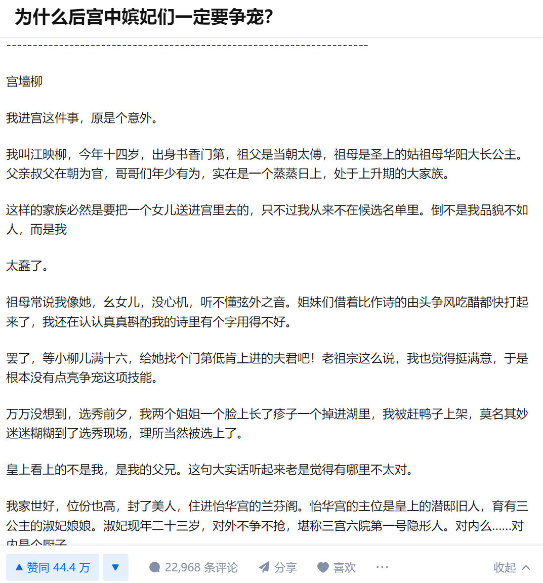 2019年4月,“梦娃”在问题“为什么后宫中妃嫔们一定要争宠”内以宫斗小说形式写下回答。这篇《宫墙柳》开了知乎网文出圈的先河。此前“梦娃”回答了十几个问题,每个问题收获的点赞量从几十到一千不等,而《宫墙柳》截至海克财经本文发稿,点赞已逾44万,评论近2.3万。