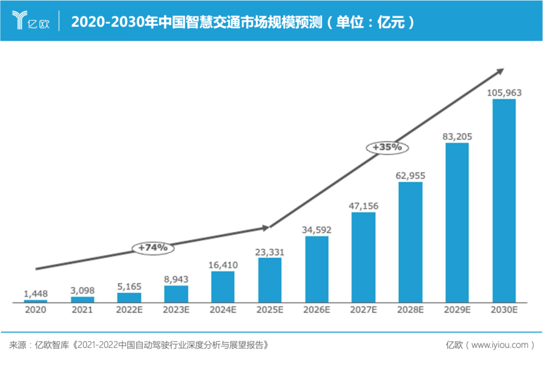 亿欧智库预测,2030年中国智慧交通市场规模将达到10.6万亿元。随着车端、路端、云端智能布局持续完善,C端需求将被逐渐释放,同时伴随着自动驾驶市场机制的形成,产业链愈加成熟,智慧交通市场未来呈现稳定增长态势。