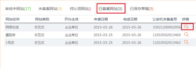 第五步:在完成以上审核以后,公安机关将会发放公安部备案号,您需要将备案号放置网站首页下端 ;您可以将网站备案代码放置在网站上,获取代码方法:在已备案网站中查看网站详情,点击【点击复制备案号】即可获得备案代码。