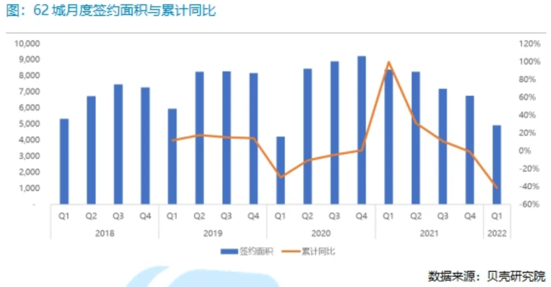 贝壳研究院数据显示,一季度全国重点62城新房商品住宅签约面积同比下降41%,三四线城市下降尤其严重,到达47%;同样,一季度二手房成交量虽较去年同期高点下降约四成。