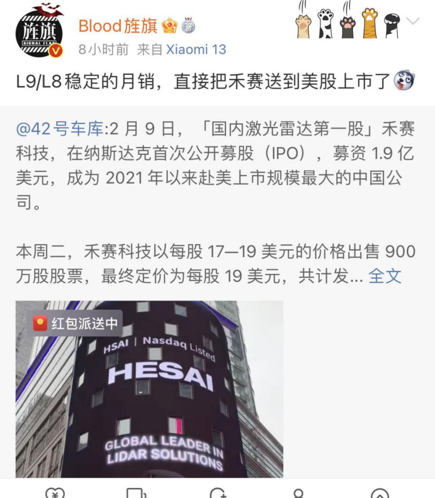 因此也有观点认为,禾赛的成功上市,是靠理想L9、L8稳定的月销。