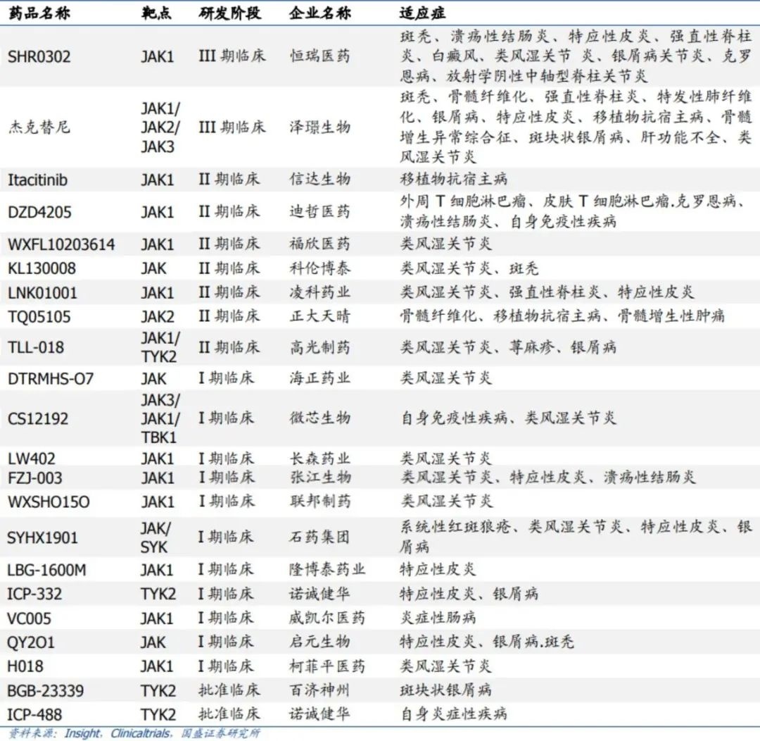 虽暂未有国产JAK抑制剂获批,但国内诸多企业也参与了布局,而且突破在望。据不完全统计,我国布局JAK抑制剂药企有10余家,在研项目多为第二代选择性抑制剂,适应症主要围绕自免领域疾病展开。