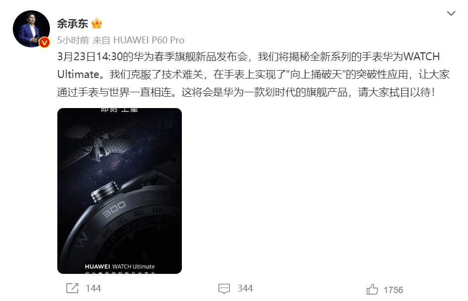 针对第一点,暂时未见智能手表厂商们没有什么动作,可能是在“憋大招”,也可能是评估过后觉得没必要跟苹果的风。而针对第二点,我们就见到了一些厂商的回应,比如说华为——3月14日,余承东预告将在3月23日发布的新品华为WATCH Ultimate,表示实现了“向上捅破天”的突破性应用,让大家通过手表与世界一直相连。