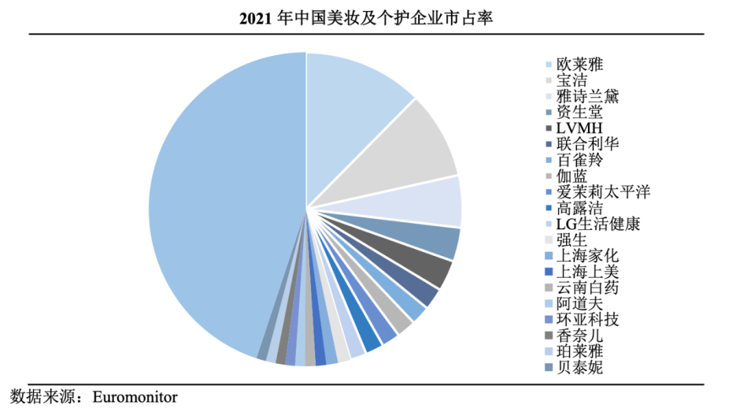 2021年,环亚以1%的市占率,在美妆及个护市场上排名第16位,本土企业中排第6。同年,欧莱雅、宝洁、联合利华分别拿下10.4%、7.7%、7%的市占率。