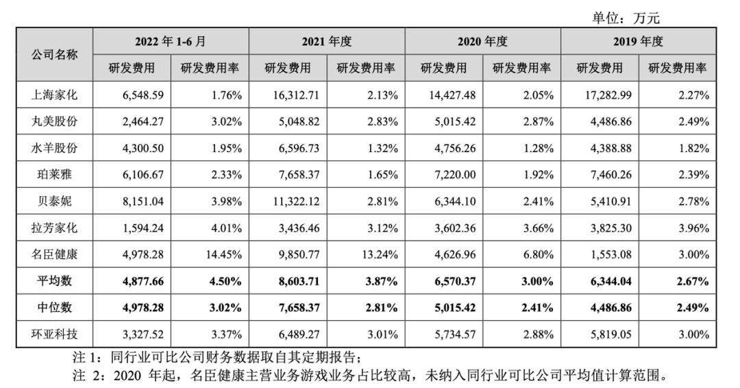 虽然有心想一较高下,但在研发上,国内美妆企业投入都少得可怜。相比之下,环亚科技的研发投入由2019年的5819万元增至2021年的6489万元,但仍低于平均数值。同时,环亚科技研发费用率显著低于同行。