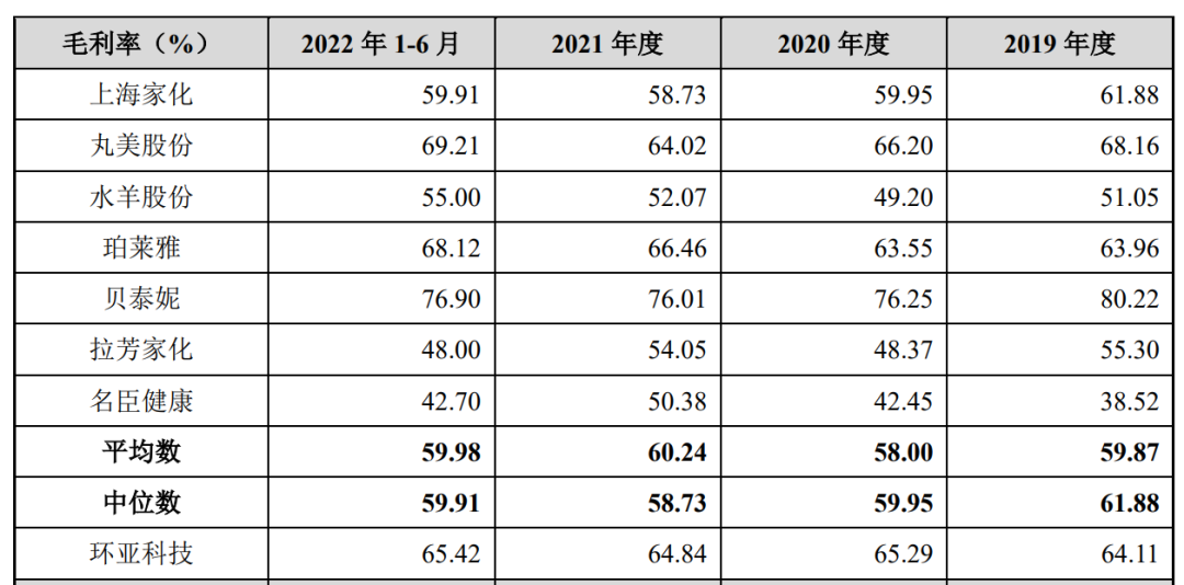 在毛利率方面,环亚科技高于行业平均水平。以2022年上半年为例,环亚科技毛利率高达65.42%,高于行业平均值59.98%;其销售净利率达13.94%,高于上海家化、珀莱雅等企业。