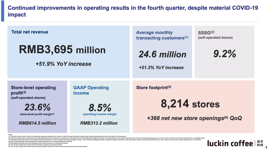 瑞幸董事长兼CEO郭谨一在财报电话会上表示,“过去的一年,瑞幸累计消费客户近 1. 35亿。2022年,瑞幸共为消费者提供了9亿杯饮品。尽管2022年第四季度新冠肺炎有重大影响,但瑞幸仍保持强劲的盈利能力。”