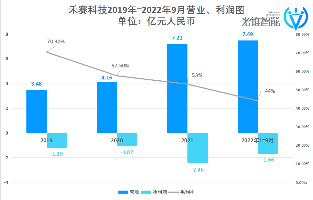 财务数据上也能看到同样的趋势,从2019年到2022年9月,禾赛科技营收分别为3.48亿、4.16亿、7.21亿和7.94亿;但毛利率却在逐渐下降,分别为70.3%、57.5%、53%和44%。