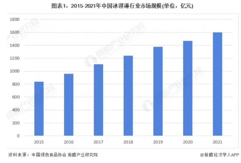 但雪糕行业是个例外,与大部分消费品类相比,雪糕市场仍然保持着一定增速。从2015到2021年,雪糕行业的市场规模由不足900亿增长至1600亿,年复合增速超过10.1%,成为同期增长最快的消费品之一。
