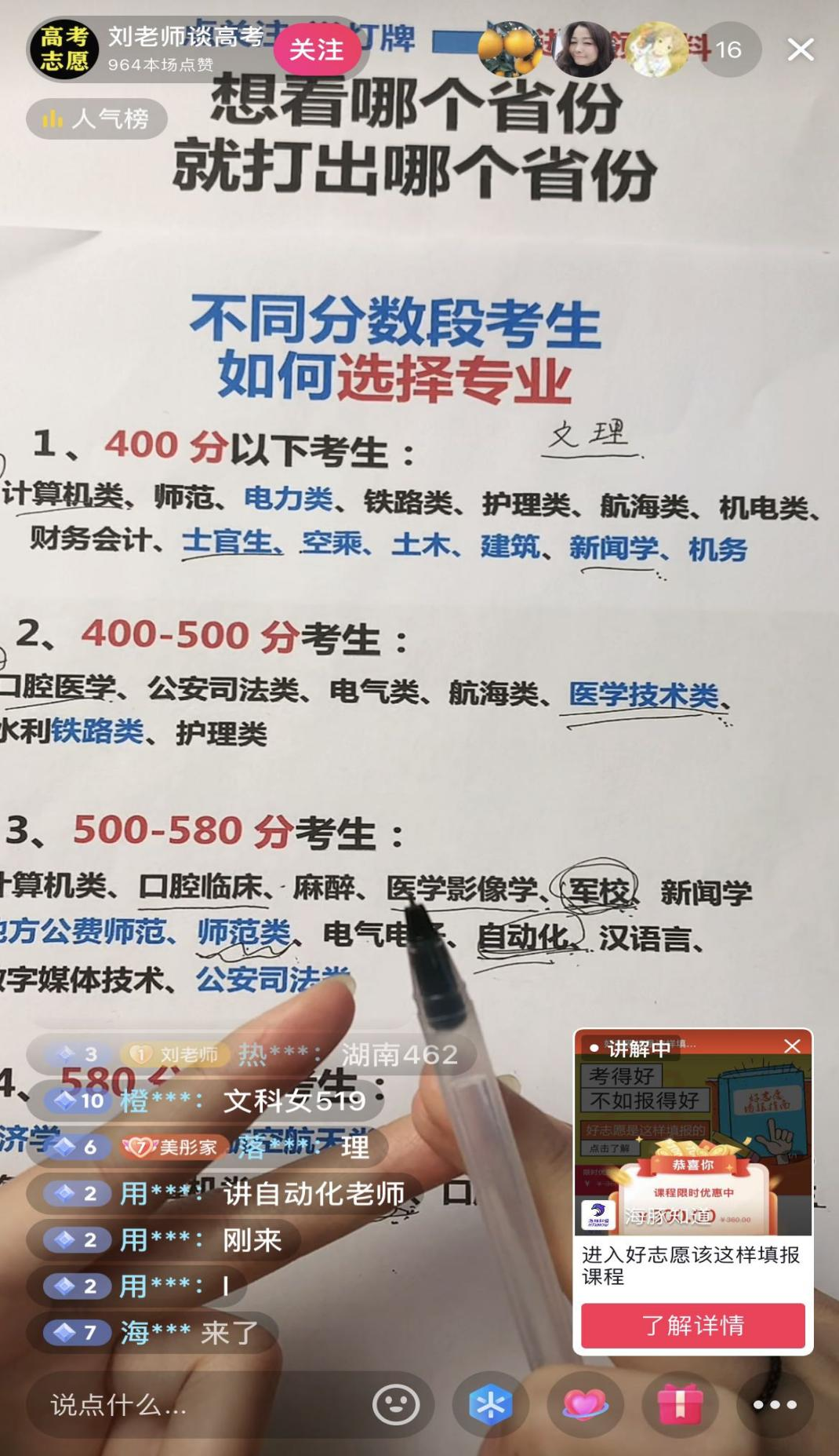 例如在6月29日下午抖音“刘老师谈高考”的一场直播中,他为家长和学生分析了不同分数段考生如何选择专业,400分以下可选择师范、铁路类、护理类、新闻学等,而580分以上,则可以选择金融学、航空航天类、法学等热门专业。