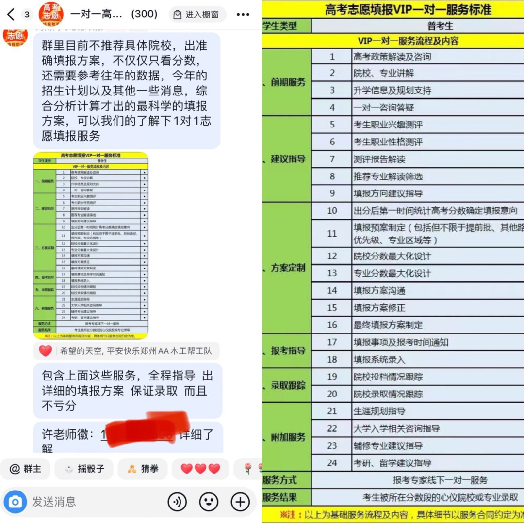 我们试图进入抖音平台某主播粉丝群,其中有不少用户询问孩子的分数可以报考什么学校,但并未得到一一具体回复。相反,群主只发出一张高考志愿填报VIP一对一服务标准图片,并表示全程指导,出详细填报方案,保证录取,且不亏分,并留下了“许老师”的微信联系方式。