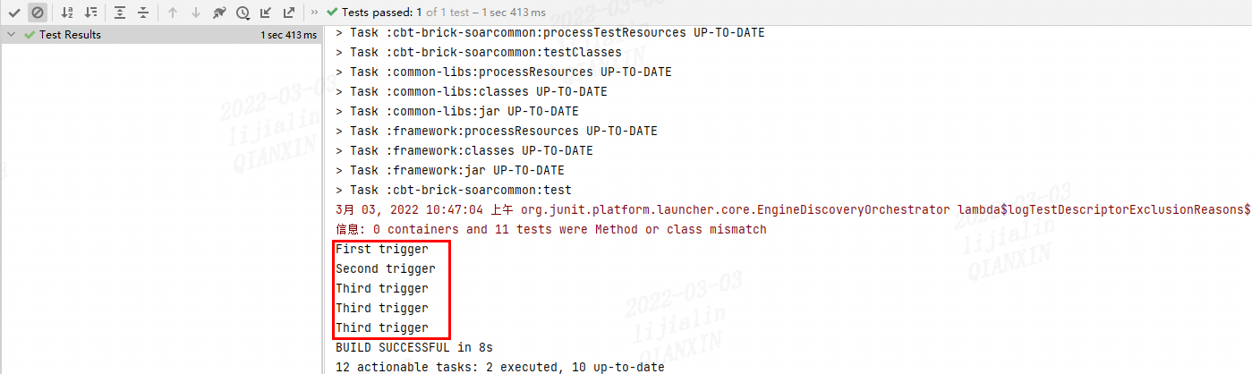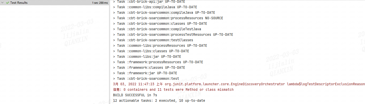 @SpringBootTest(classes = ScheduleSetup.class)@AutoConfigureMockMvcclass ScheduleEndpointTest { @Autowired private MockMvc mockMvc; private ScheduleService scheduleService; @BeforeEach void initScheduleService() { scheduleService = mock(ScheduleServiceImpl.class); } @Test void add_schedule() { try { System.out.println("scheduleService>>>" + scheduleService); //构造请求数据 Map<String, Integer> startPolicyParams = new HashMap<>(); ScheduleDTO scheduleDTO = ScheduleDTO.builder().name("单元测试-1").owner("lijialin").severity(Severity.HIGH) .description("hah").startPolicyType(StartPolicyType.ONCE).startPolicyParams(null) .startTime(System.currentTimeMillis()).paramData(null).createBy("lijialin") .build(); //模拟post请求 mockMvc.perform(MockMvcRequestBuilders.post("/v1/soar-common/schedules") .content(JsonUtil.toJson(scheduleDTO)) .contentType(MediaType.APPLICATION_JSON)) /*.andExpect(MockMvcResultMatchers.status().isOk())*/; assertThat(scheduleService.existsByName("单元测试-1")); } catch (Exception e) { e.printStackTrace(); } }2.2 Application-Service层class ScheduleApplicationServiceTest { private ScheduleApplicationService applicationService; private ScheduleService scheduleService; @BeforeEach void init() { applicationService = new ScheduleApplicationService(mock(ScheduleServiceImpl.class), mock(ScheduleRecordServiceImpl.class)); scheduleService = mock(ScheduleServiceImpl.class); } @Test void edit() { Map<String, Integer> paramsMap = new HashMap<>(); paramsMap.put("week", 6); paramsMap.put("hour", 8); paramsMap.put("minute", 12); paramsMap.put("interval", 1); ScheduleDTO scheduleDTO = ScheduleDTO.builder().name("新增调度1") .createBy("lijialin") .severity(Severity.HIGH) .startTime(1646387494000L) .startPolicyType(StartPolicyType.WEEKLY) .endPolicyType(EndPolicyType.END_TIME) .endPolicyValue(1646964300000L) .startPolicyParams(paramsMap) .build(); applicationService.save(scheduleDTO); assertThat(scheduleService.existsByName("新增调度1")); ScheduleEditDTO scheduleEditDTO = ScheduleEditDTO.builder() .id("37f62f73-65fc-4c00-89ff-eff295f784bf") .name("编辑调度1") .createBy("lijialin") .severity(Severity.HIGH) .startTime(1646387494000L) .startPolicyType(StartPolicyType.WEEKLY) .endPolicyType(EndPolicyType.END_TIME) .endPolicyValue(1646784300000L) .startPolicyParams(paramsMap) .build(); applicationService.edit(scheduleEditDTO); assertThat(scheduleService.existsByName("编辑调度1")); }}2.3 Domain-Service层@Slf4jclass ScheduleServiceImplTest { private ScheduleService scheduleService; private Scheduler scheduler; @BeforeEach void init() { scheduler = mock(Scheduler.class); scheduleService = new ScheduleServiceImpl(scheduler); } @Test void addSchedule() { Map<String, Object> cornParams = new HashMap<>(); cornParams.put("type", "ONCE"); String cornParamsStr = JsonUtil.toJson(cornParams); ScheduleObject scheduleObject = ScheduleObject.builder().uuid("72bc5a2d-e5ee-4e83-9866-32b0df54bdb2") .name("单元测试-6") .creator("lijialin") .owner("lijialin") .type("ONCE") .severity(3) .description("desc...") .startTime(System.currentTimeMillis()) .cornParams(cornParamsStr) .build(); scheduleService.addSchedule(scheduleObject); assertThat(scheduleService.existsByName("单元测试-6")); }