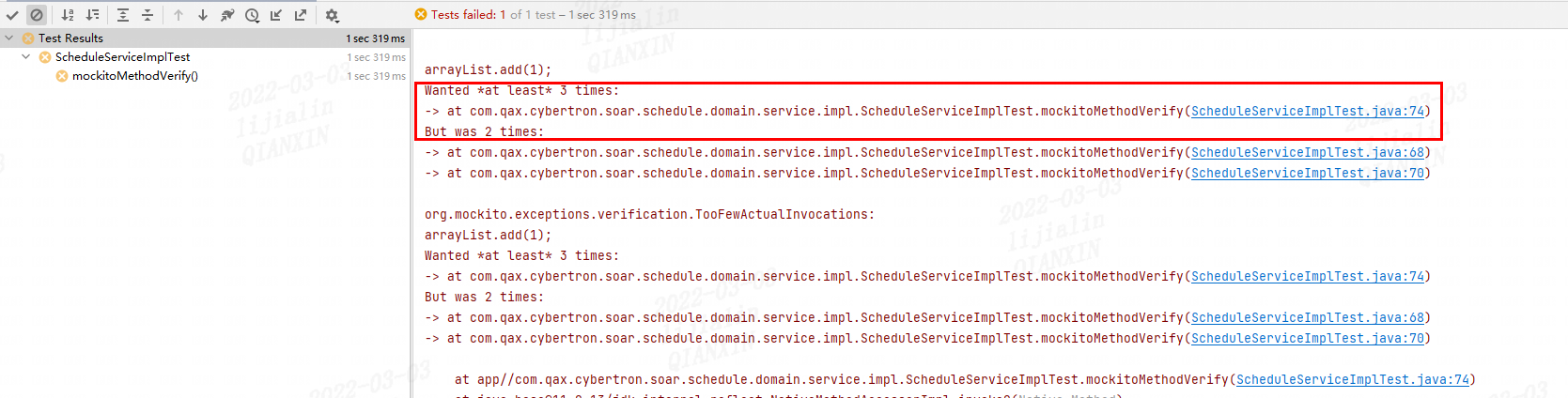 @Test void mockitoMethodVerify(){ ArrayList mockList = mock(ArrayList.class); //验证方法是否被调用及执行次数 mockList.add(1); mockList.add(1); verify(mockList,atLeast(3)).add(1); }