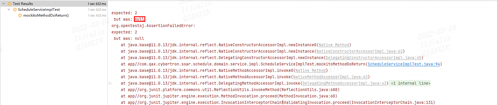 @BeforeEachvoid init() { scheduler = mock(Scheduler.class); scheduleService = new ScheduleServiceImpl(scheduler);}参数匹配:anyInt()、anyLong()、anyFloat()、anyDouble(),匹配任意xx类型数据@Testvoid testMoc(){ ArrayList test = mock(ArrayList.class); when(test.get(anyInt())).thenReturn("mock argumentMatcher"); System.out.println(test.get(0));}设置对象调用的预期返回值:when(condition).thenReturn(value1); 当满足when中条件时候,返回value1;当不满足时候,返回nullwhen(condition).thenReturn(value1).thenReturn(value2); 当满足when中条件时候,第一次返回value1,第n(n>1且∈N*)次返回value2when(condition).thenReturn(value1)...thenReturn(valuen); 当满足when中条件时候,第一次返回value1,第二次返回value2...第n(n>1且∈N*)次返回valuendoReturn().when().someMethod(); 与thenReturn()的区别是不会调用真实方法示例如下:当满足when中条件时候,返回value1:@Testvoid mockitoMethodWhenThen(){ ArrayList mockList = mock(ArrayList.class); //参数匹配(when中条件不满足时候,renturn null) when(mockList.get(anyInt())).thenReturn("mock argumentMatcher"); System.out.println(mockList.get(0));}当不满足条件时候,返回null:@Testvoid mockitoMethodWhenThen(){ ArrayList mockList = mock(ArrayList.class); //参数匹配(when中条件不满足时候,renturn null) when(mockList.get(1)).thenReturn("mock argumentMatcher"); System.out.println(mockList.get(0));}