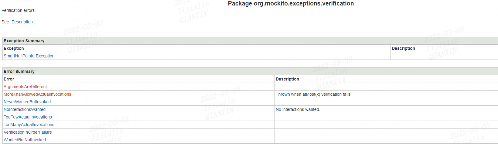 API如下所示:/** * Verifies certain behavior <b>happened once</b>. * <p> * Alias to <code>verify(mock, times(1))</code> E.g: * <pre class="code"><code class="java"> * verify(mock).someMethod("some arg"); * </code></pre> * Above is equivalent to: * <pre class="code"><code class="java"> * verify(mock, times(1)).someMethod("some arg"); * </code></pre> * <p> * Arguments passed are compared using <code>equals()</code> method. * Read about {@link ArgumentCaptor} or {@link ArgumentMatcher} to find out other ways of matching / asserting arguments passed. * <p> * Although it is possible to verify a stubbed invocation, usually <b>it's just redundant</b>. * Let's say you've stubbed <code>foo.bar()</code>. * If your code cares what <code>foo.bar()</code> returns then something else breaks(often before even <code>verify()</code> gets executed). * If your code doesn't care what <code>foo.bar()</code> returns then it should not be stubbed. * * <p> * See examples in javadoc for {@link Mockito} class * * @param mock to be verified * @return mock object itself */@CheckReturnValuepublic static <T> T verify(T mock) { return MOCKITO_CORE.verify(mock, times(1));}``````/** * Verifies certain behavior happened at least once / exact number of times / never. E.g: * <pre class="code"><code class="java"> * verify(mock, times(5)).someMethod("was called five times"); * * verify(mock, atLeast(2)).someMethod("was called at least two times"); * * //you can use flexible argument matchers, e.g: * verify(mock, atLeastOnce()).someMethod(<b>anyString()</b>); * </code></pre> * * <b>times(1) is the default</b> and can be omitted * <p> * Arguments passed are compared using <code>equals()</code> method. * Read about {@link ArgumentCaptor} or {@link ArgumentMatcher} to find out other ways of matching / asserting arguments passed. * <p> * * @param mock to be verified * @param mode times(x), atLeastOnce() or never() * * @return mock object itself */@CheckReturnValuepublic static <T> T verify(T mock, VerificationMode mode) { return MOCKITO_CORE.verify(mock, mode);}``````/** * Allows verifying exact number of invocations. E.g: * <pre class="code"><code class="java"> * verify(mock, times(2)).someMethod("some arg"); * </code></pre> * * See examples in javadoc for {@link Mockito} class * * @param wantedNumberOfInvocations wanted number of invocations * * @return verification mode */@CheckReturnValuepublic static VerificationMode times(int wantedNumberOfInvocations) { return VerificationModeFactory.times(wantedNumberOfInvocations);}``````/** * Alias to <code>times(0)</code>, see {@link Mockito#times(int)} * <p> * Verifies that interaction did not happen. E.g: * <pre class="code"><code class="java"> * verify(mock, never()).someMethod(); * </code></pre> * * <p> * If you want to verify there were NO interactions with the mock * check out {@link Mockito#verifyZeroInteractions(Object...)} * or {@link Mockito#verifyNoMoreInteractions(Object...)} * <p> * See examples in javadoc for {@link Mockito} class * * @return verification mode */@CheckReturnValuepublic static VerificationMode never() { return times(0);}``````/** * Allows at-least-once verification. E.g: * <pre class="code"><code class="java"> * verify(mock, atLeastOnce()).someMethod("some arg"); * </code></pre> * Alias to <code>atLeast(1)</code>. * <p> * See examples in javadoc for {@link Mockito} class * * @return verification mode */@CheckReturnValuepublic static VerificationMode atLeastOnce() { return VerificationModeFactory.atLeastOnce();}``````/** * Allows at-least-x verification. E.g: * <pre class="code"><code class="java"> * verify(mock, atLeast(3)).someMethod("some arg"); * </code></pre> * * See examples in javadoc for {@link Mockito} class * * @param minNumberOfInvocations minimum number of invocations * * @return verification mode */@CheckReturnValuepublic static VerificationMode atLeast(int minNumberOfInvocations) { return VerificationModeFactory.atLeast(minNumberOfInvocations);}``````/** * Allows at-most-once verification. E.g: * <pre class="code"><code class="java"> * verify(mock, atMostOnce()).someMethod("some arg"); * </code></pre> * Alias to <code>atMost(1)</code>. * <p> * See examples in javadoc for {@link Mockito} class * * @return verification mode */@CheckReturnValuepublic static VerificationMode atMostOnce() { return VerificationModeFactory.atMostOnce();}``````/** * Allows at-most-x verification. E.g: * <pre class="code"><code class="java"> * verify(mock, atMost(3)).someMethod("some arg"); * </code></pre> * * See examples in javadoc for {@link Mockito} class * * @param maxNumberOfInvocations max number of invocations * * @return verification mode */@CheckReturnValuepublic static VerificationMode atMost(int maxNumberOfInvocations) { return VerificationModeFactory.atMost(maxNumberOfInvocations);}验证失败对应的异常: