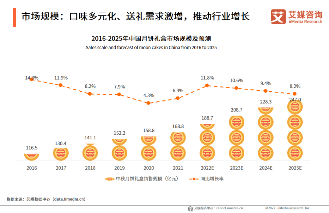 有公开信息显示,月饼的毛利率在50%以上,不少月饼厂商一年仅卖一个季度,便能达成全年销售总目标。另据艾媒咨询数据显示,2022年中国月饼礼盒销售额达到188.7亿元,同比增长11.8%,2025年将达247.0亿元。