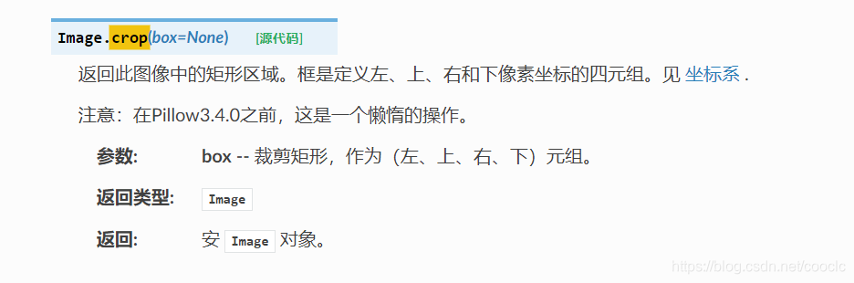 ** 开发环境用到的是python的PIL库,具体的安装在这篇文章又提及【环境搭建传送门】,其中使用到的方法是Image的crop方法,该方法提供了截取图片的功能。我们去看看它的文档**