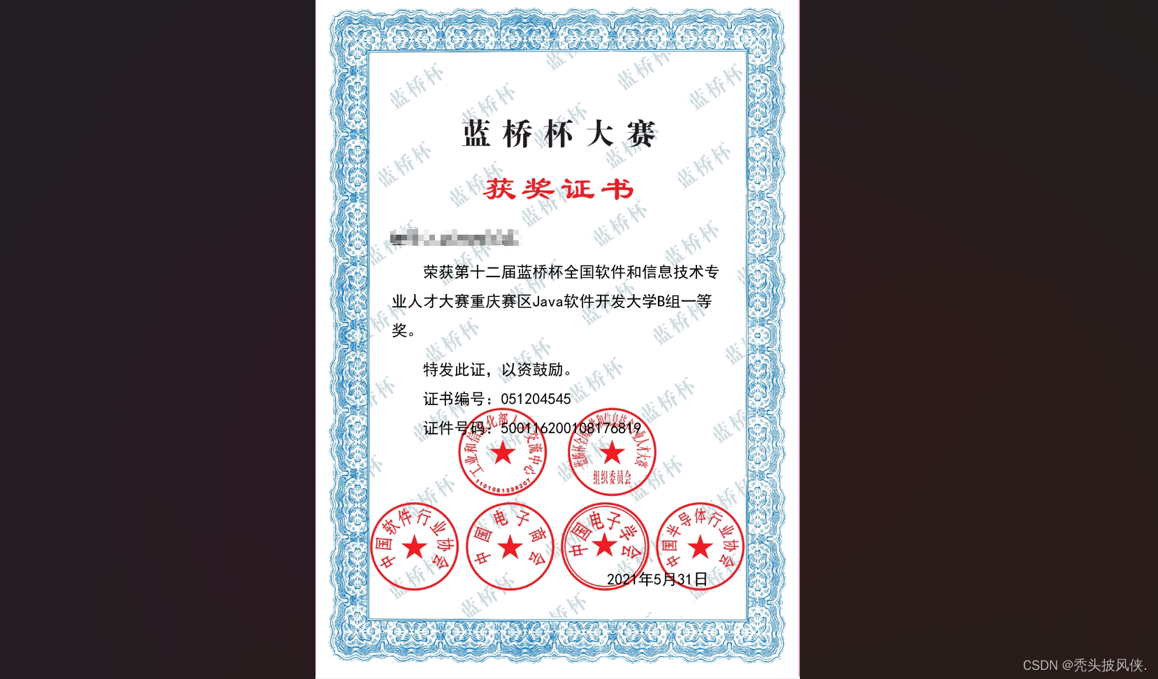 蓝桥杯省赛考的比较基础,除了最后一题,其他基本都是简单或者中等题,我们不需要所有题都做出来,只需要保证自己会做的不错,那么省一基本没有什么问题。下面是我上一次参加省赛的奖状