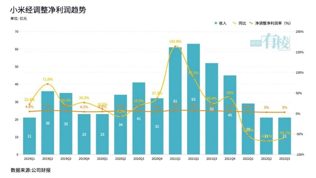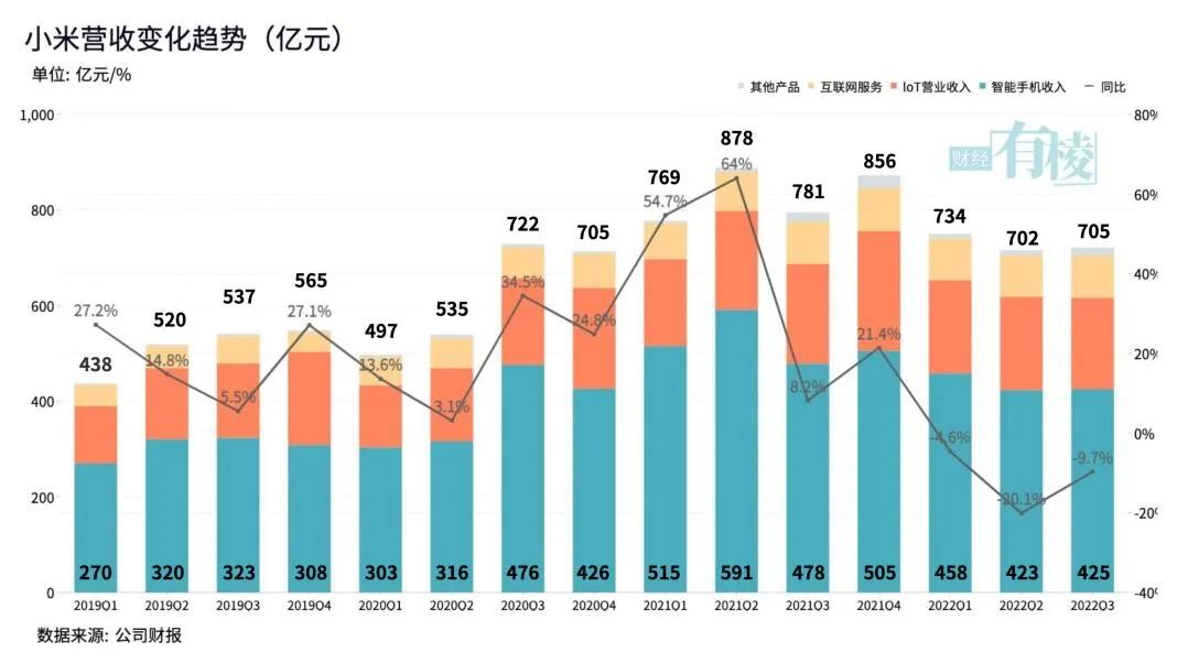 小米再度失速又失“粟”。11月23日,小米发布了2022年Q3财报,营收705亿元,同比下滑9.7%;继今年一季度,再次录得单季净亏损14.74亿元,经调整净利润21亿元,同比下滑59.1%。
