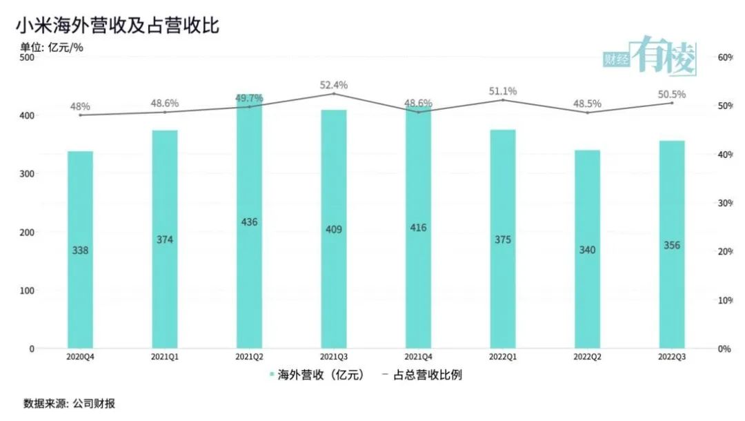 Q3小米海外营收为356亿元人民币,同比下滑12.9%,但营收占比依然高达50.5%。