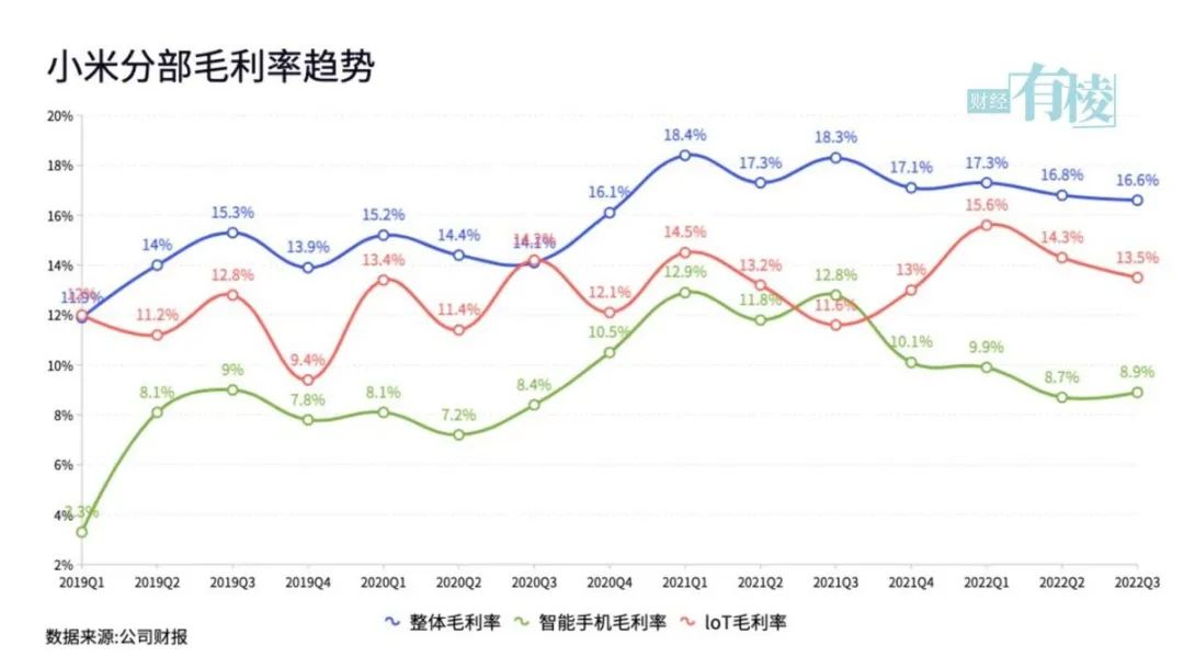 受制于硬件毛利率,小米整体毛利率一直不高。近两季手机毛利率出现大幅下滑,也导致整体毛利率连续下滑。