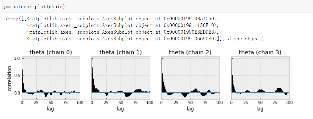 最理想的采样应该不会是自相关的,也就是说,某一点的值应该与其他点的值是相互独立的。由于参数之间的相互依赖关系,可能模型会导致更多的自相关采样。PyMC3有一个很方便的函数用来描述自相关。