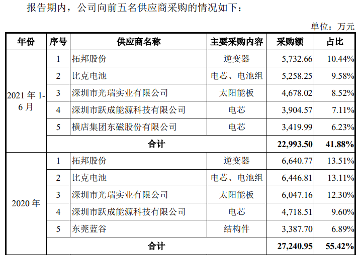 华宝新能向深圳市光瑞实业主要采购太阳能板,向深圳市跃成能源主要采购电芯、电池组,2020年的采购额分别为6047万元、4719万元。