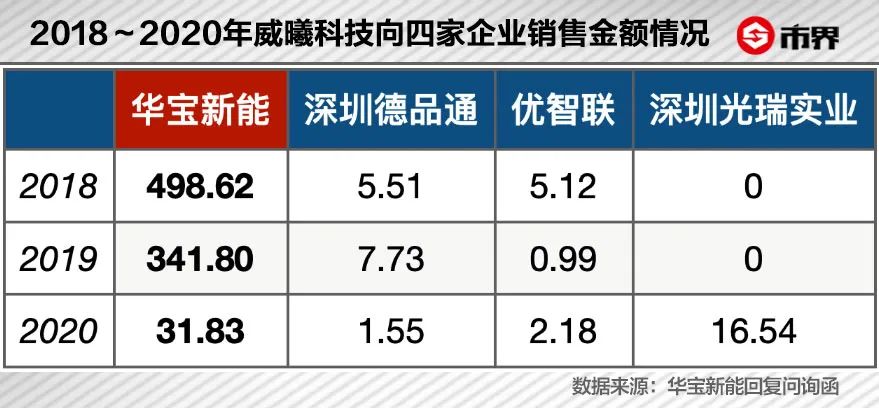 对于此,另一个佐证是,从2018年至2021年上半年,威曦科技还曾向深圳市德品通(由华宝新能原监事、孙中伟表妹褚艳秋的妹夫控制)、优智联(华宝新能原董事雷松波控制)、深圳市光瑞实业(华宝新能供应商)等多家企业销售数据线产品,但销售规模相比较小。