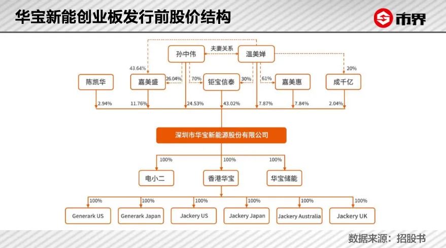 华宝新能的股权高度集中。发行前,孙氏夫妇通过直接和间接(通过钜宝信泰、嘉美盛、嘉美惠、成千亿)的方式,合计持有华宝新能88.81%股份。其中,孙中伟为公司董事长,温美婵为副董事长、副总经理。