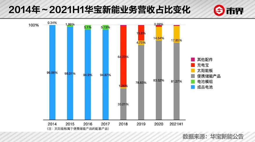 从业绩数据可以看出,直到2018年,充电宝业务还是华宝新能营业收入的大头,当期占比高达64.23%。也是从2018年开始,华宝新能在国内外电商平台销售便携储能产品。之后两年,伴随着生产线调整,并将相关设备用于便携储能产品的生产,充电宝营收占比遽然下滑,到2020年仅占0.99%,2021上半年直接归零。