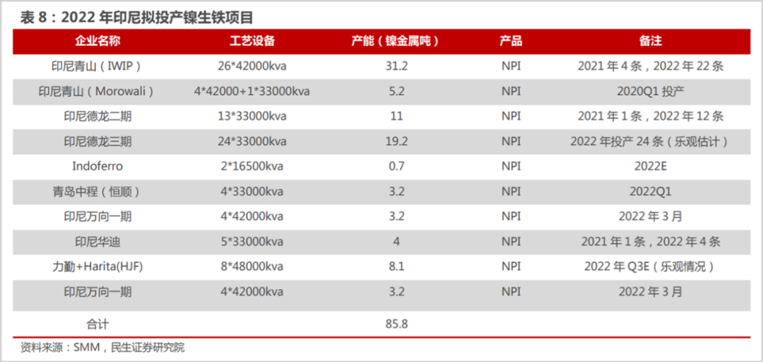 其中在PKEF火法转高冰镍项目中,自青山高冰镍技术取得突破后,将在今年年内向华友和中伟供给共计10万吨,加上友山和华科项目高冰镍生产能力,以及中青新能源的1万吨投产,预计今年印尼高冰镍的增量可达到18万吨。