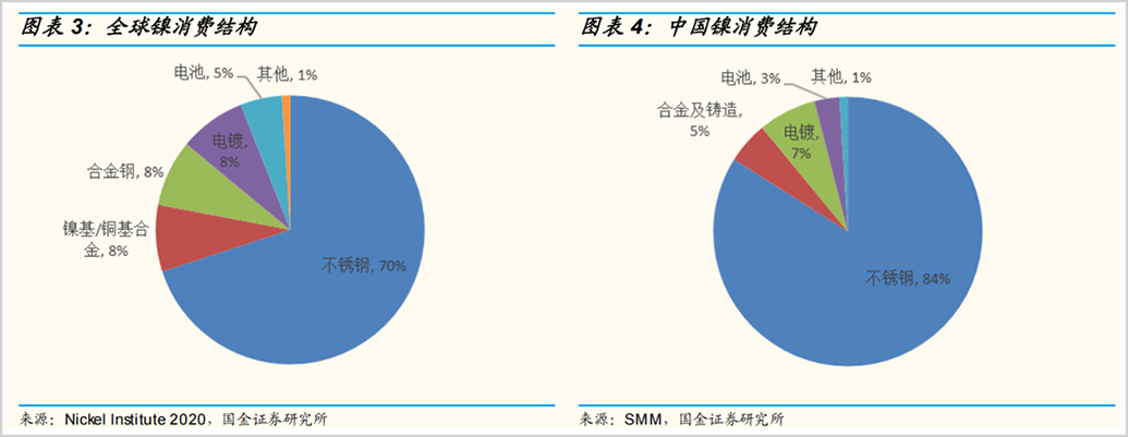 当前镍被用于传统工业的比例仍然较高。据国金证券研究显示,在全球镍的消费结构中,不锈钢使用占比高达70%,电池领域的镍消费量占比只有5%。