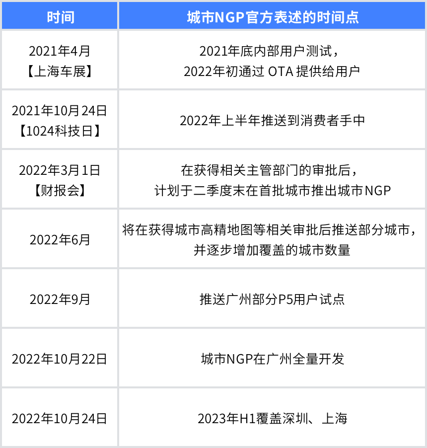 下面这张表,列举了不同时间和场合下,小鹏官方对该功能发布时间的表态: