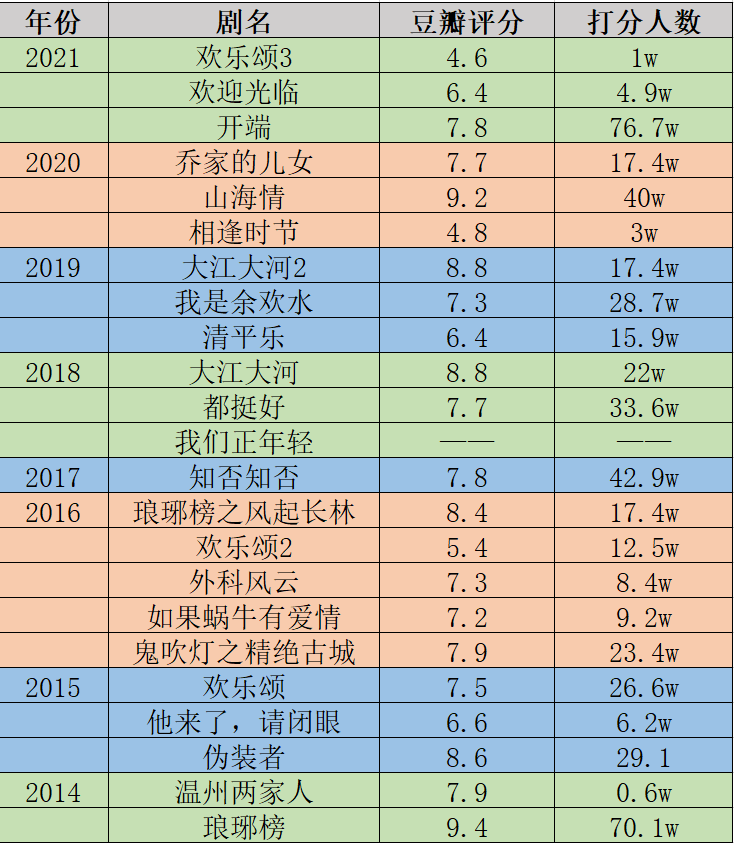 从2014年脱胎于山影依始,正午阳光上交给市场的成绩单格外显眼。娱乐独角兽简单整理了一份正午阳光从2014-2021年(按照剧集拍摄时间整理),其公司的作品成绩。可以发现,2014年-2018年是正午阳光获得市场称赞的高光时刻,这几年里,正午阳光打造的无论是古装题材《琅琊榜》,亦或者是开拓新业务,培养正午“二代”导演制造的部分网剧,如《如果蜗牛有爱情》《鬼吹灯之精绝古城》等,都在市场影响极大反响。