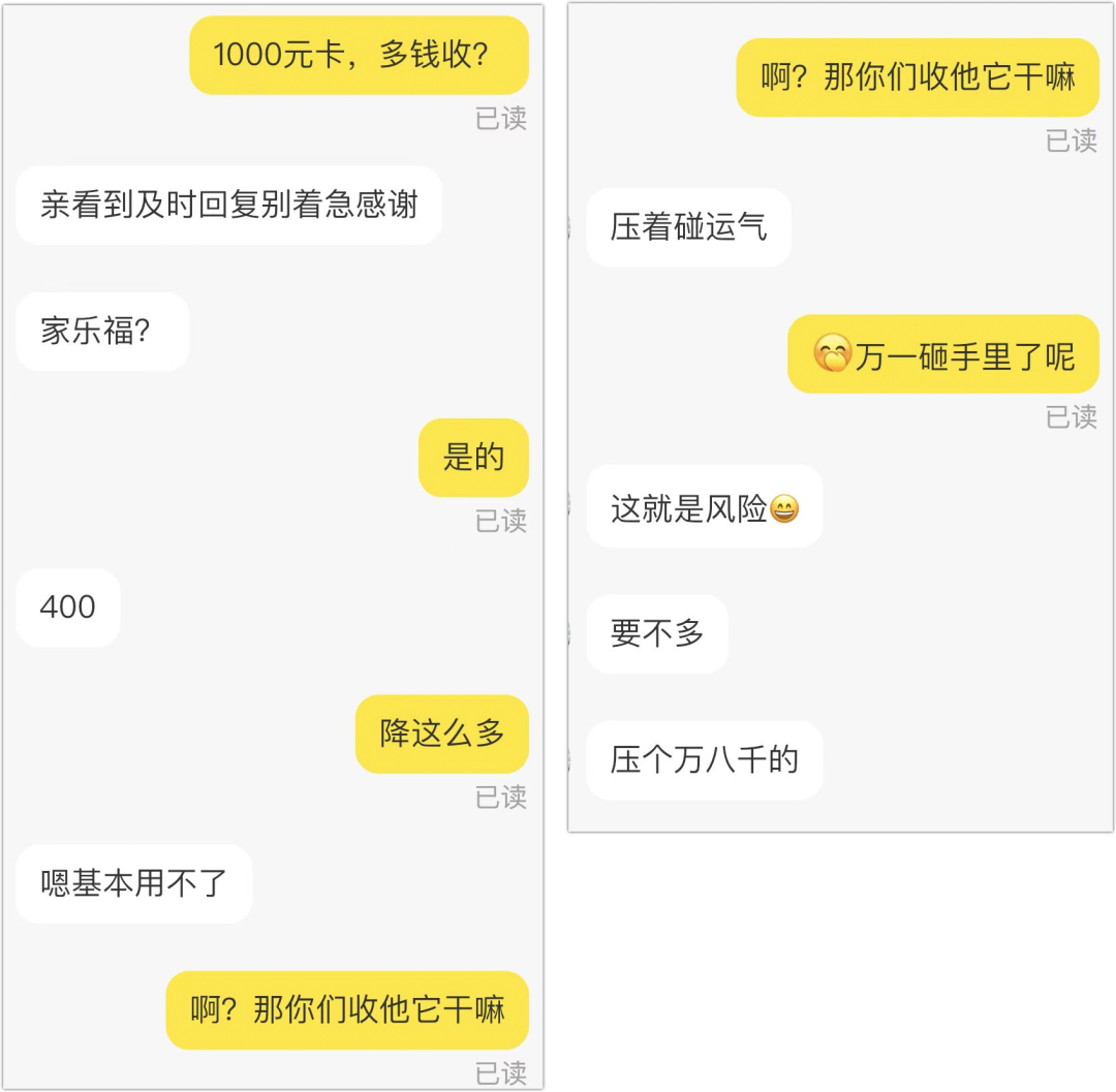 有黄牛规避风险,也有黄牛选择冒险搏一搏。《凤凰WEEKLY财经》在随机询问了几位目前还收卡的黄牛,1000元面值的家乐福购物卡,回收价为350或400元。至于如今这个节点为何还会收卡,他们表示:“基本用不了,压着碰运气”“要不多,压个万八千的”。