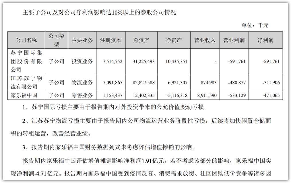 同时,苏宁已经将家乐福视为业绩的累赘。苏宁易购在2022年三季报中表示,当前公司仍处于净利润亏损状态,其中家乐福是非常重要的影响因素,较高的固定租金成本难以分摊。2022年半年报显示,家乐福中国同期对苏宁易购净利润影响约为-4.71亿元,占比超过同期公司净利润的10%。
