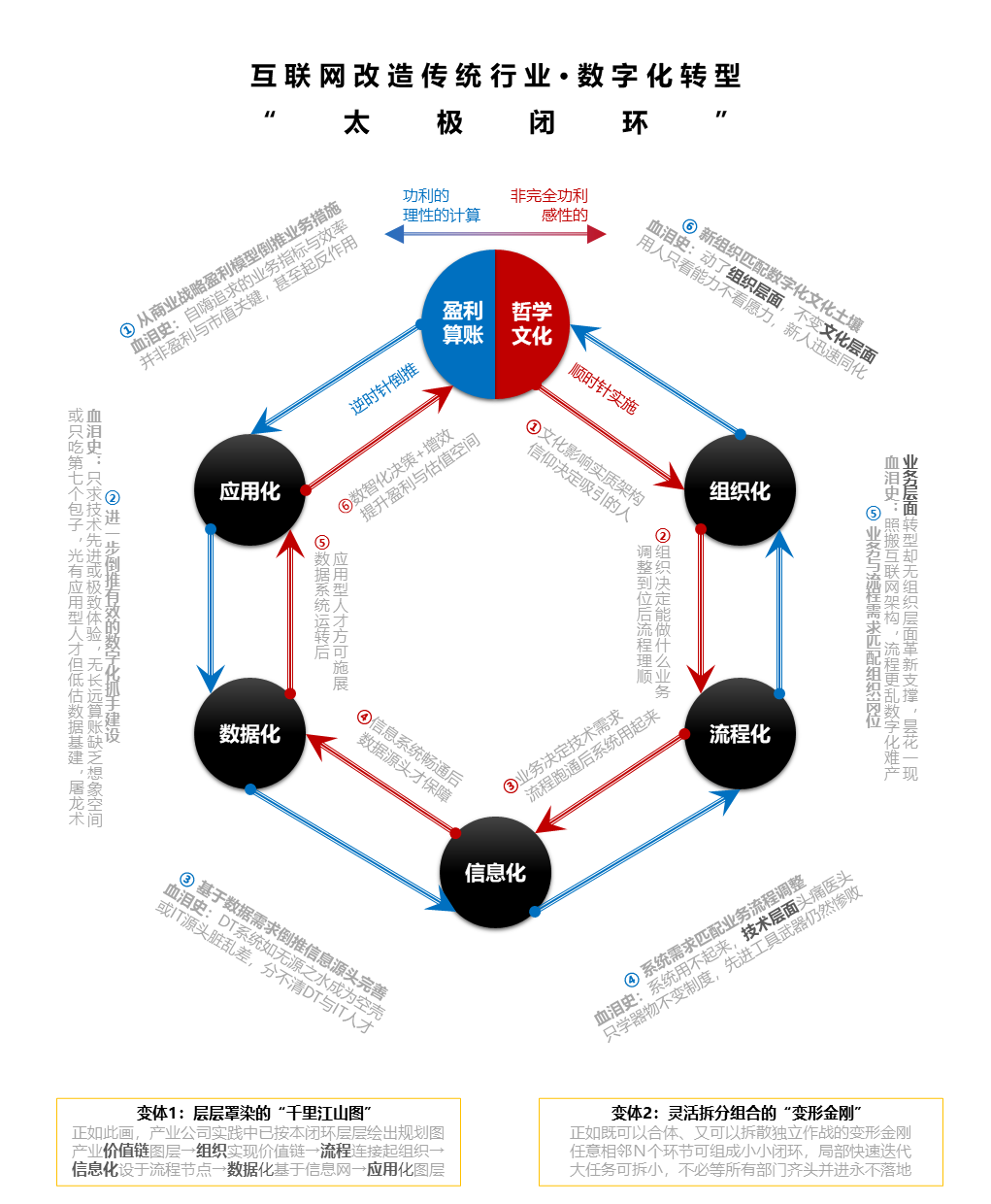 而实施则是顺时针逐层疏通的,企业哲学文化决定组织、吸引什么人;组织调整到位,流程化才通畅;流程跑通了,信息化系统才用起来;信息源头治理好了,才能灌入数据让数据化平台运转;数据化基础具备了,应用型人才方能发挥作用;有效的业务措施、运营模式、应用场景,最终让企业的盈利和市值双丰收。神奇地发现,从一个原点又能回到另一个原点、相互转化。