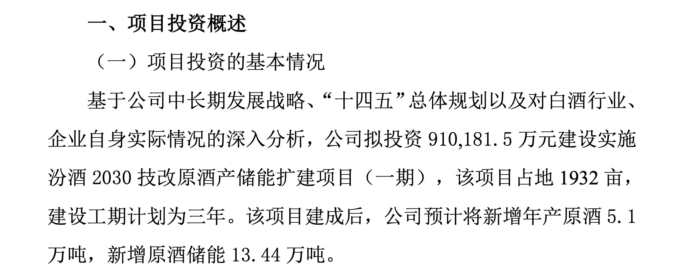 2022年3月17日,汾酒披露“汾酒2030技改原酒产储能扩建项目(一期)”公告,宣布拟投资91亿元建设原酒产储能扩建项目。根据公告信息,该项目占地1932亩,建设工期计划为三年。项目建成后,汾酒预计将新增年产原酒5.1万吨,新增原酒储能13.44万吨。