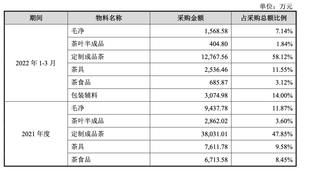 和澜沧古茶、中国茶业的自主生产模式不同,八马茶业奉行“拿来主义”。招股书显示,2019年-2021年,八马茶业采购产品中定制成品茶占比分别为51.92%、47.42%和47.85%。