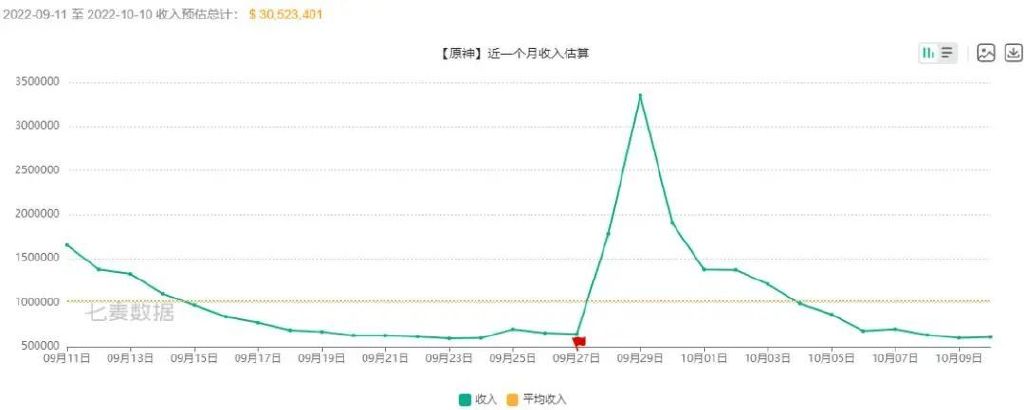 七麦数据显示,近一个月来,原神基本稳定在游戏榜的前三名,仅Ios端的收入预估就达到了3052.3万美元,约合2.19亿人民币。