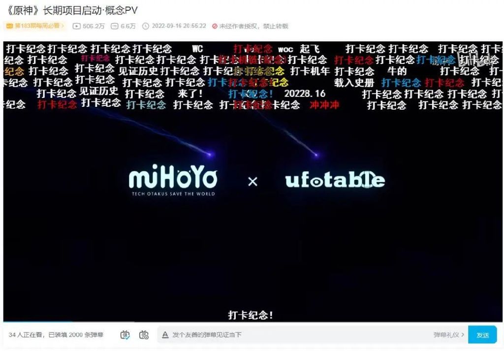 同样是在此次二周年活动的宣发期间,9月16日,原神官方微博宣布与日本Ufotable(飞碟社)进行长期合作,双方共同制作的《原神》动画项目将正式启动。这一消息得到了不少玩家的欢迎,截止目前,其短短3分半的PV在B站的播放量便突破了506.2万,共填装了超过6.6万弹幕。