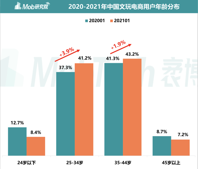 2020年-2021年中国文玩电商用户年龄分布来源 / Mob研究院《2021文玩电商行业洞察报告》