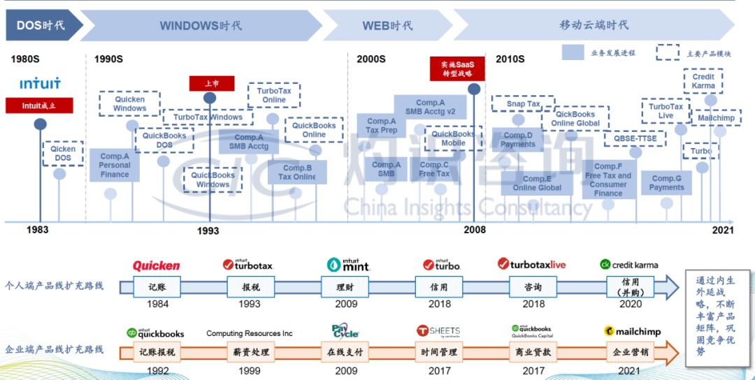 在后天自身发展方面,Intuit已经靠着B端和C端搭建了完整的财税生态。国内财税SaaS想靠风口、概念冲刺市值,难以与前者画上等号。除了主打产品Quicken, Intuit还收购了美国最大的报税软件产品Tuibotax的母公司ChipSoft,以及在线支付服务平台PayCycle Inc.,并通过个人信用软件Turbo Tax、个人理财网站Mint.com等产品服务于不同类型的客户。