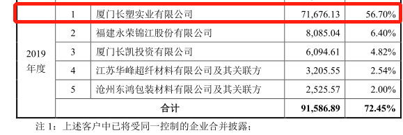 除此之外,2019年中仑新材向长塑实业产生的销售收入为71676.13万元,占当期营业收入的比例为56.7%。