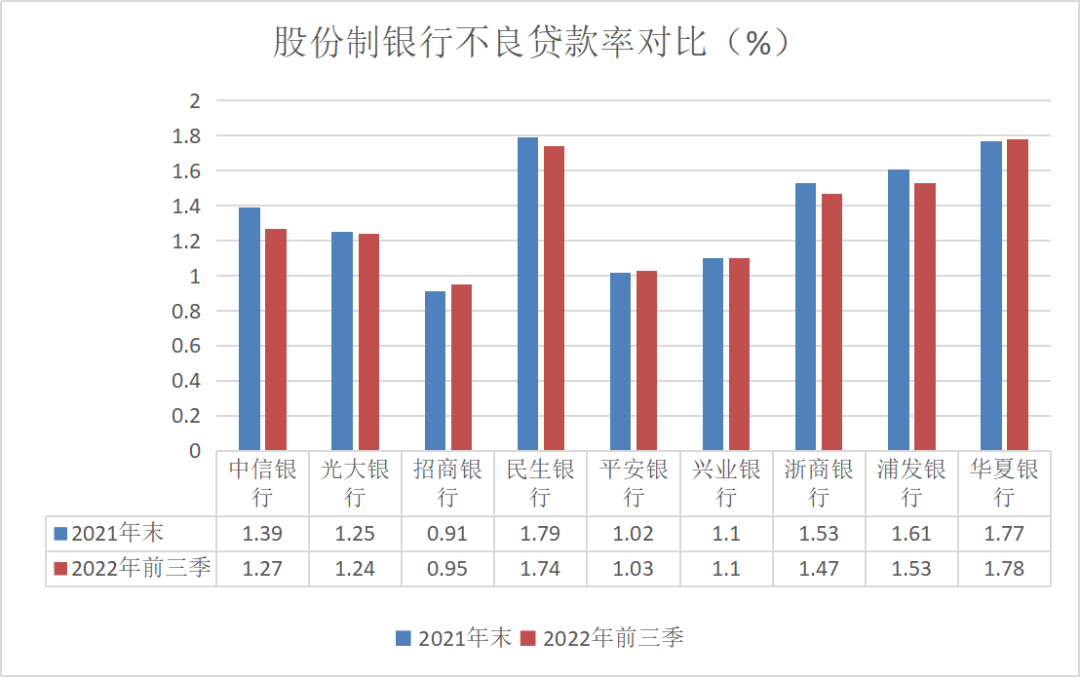 2022年前三季度,九家股份制银行中,招商银行、平安银行和华夏银行的不良贷款率较2021年末略有上升,招商银行涨幅最大,增加了0.04个百分点,另外两家则均增加了0.01个百分点。兴业银行的不良贷款率维持在0.01%没有变化,其余五家则有所下降,降幅最大的为中信银行,不良贷款率减少了0.12个百分点。