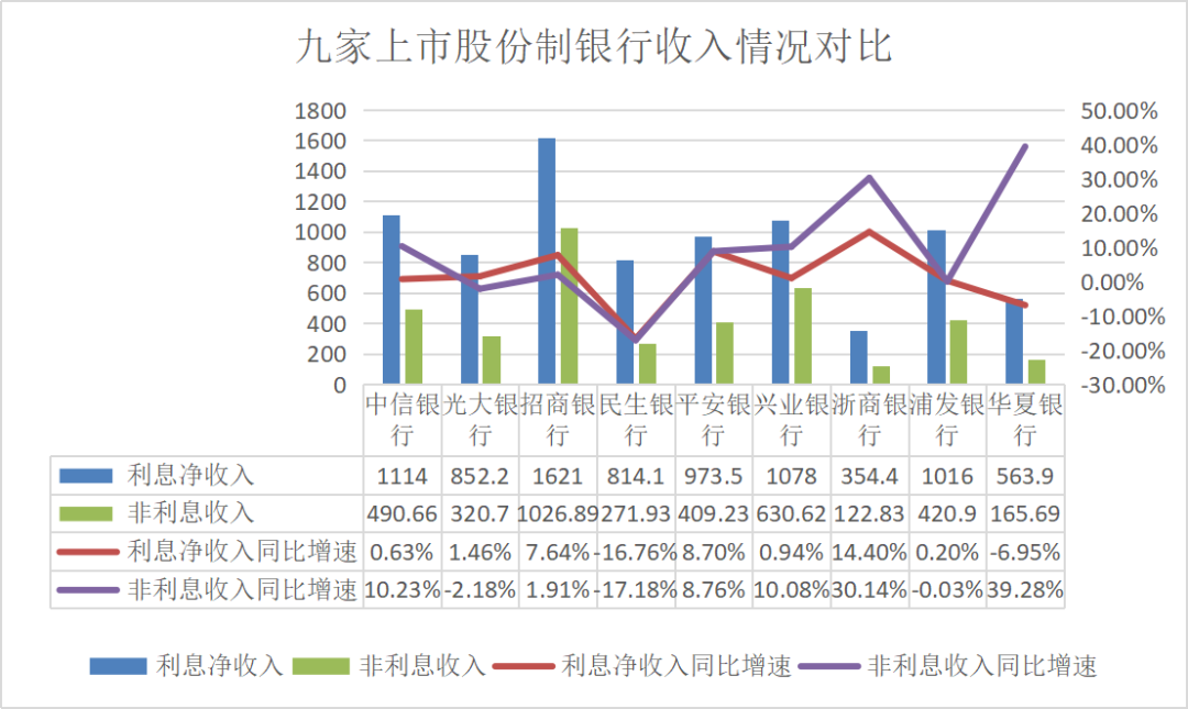 从收入类型来看,九家上市股份制银行的利息净收入合计达到8387.1亿元,同比增长仅为0.75%。其中,招商银行利息净收入最高,达到1621亿元,同比增速7.64%,排名第三。只有四家银行的利息净收入突破了一千亿元。同比增速最高的为浙商银行,达14.4%。