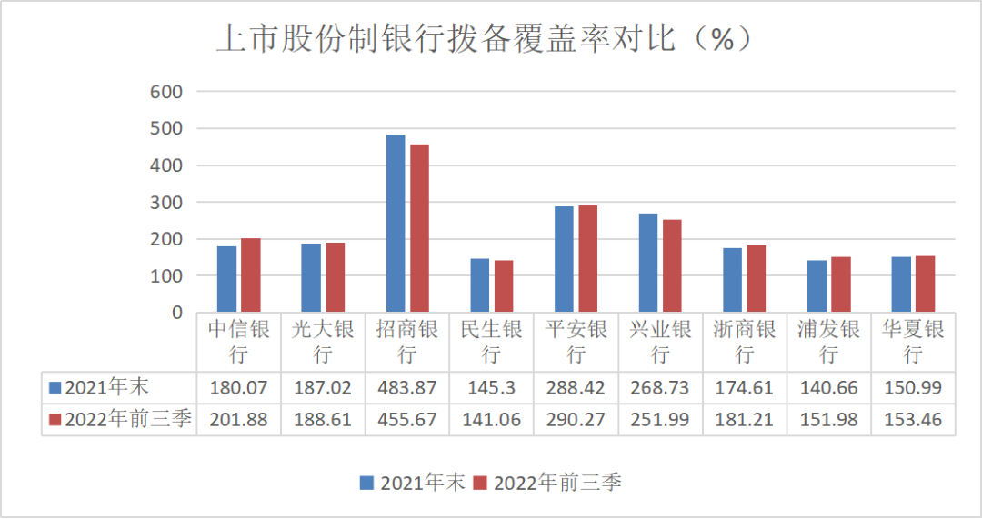 拨备覆盖率方面,招商银行一骑绝尘,高达450%以上,比排名第二的平安银行高出200多个百分点, 2022年前三季度达到455.67%,但较2021年末的483.87%下降了28.2个百分点。除招商银行外,民生银行和兴业银行的拨备覆盖率也出现了环比下降,分别下降了4.24个百分点和16.74个百分点。其余六家股份制银行则实现了环比回升,其中中信银行增长最大,实现了21.81个百分点的提升,拨备覆盖率首次突破200%。
