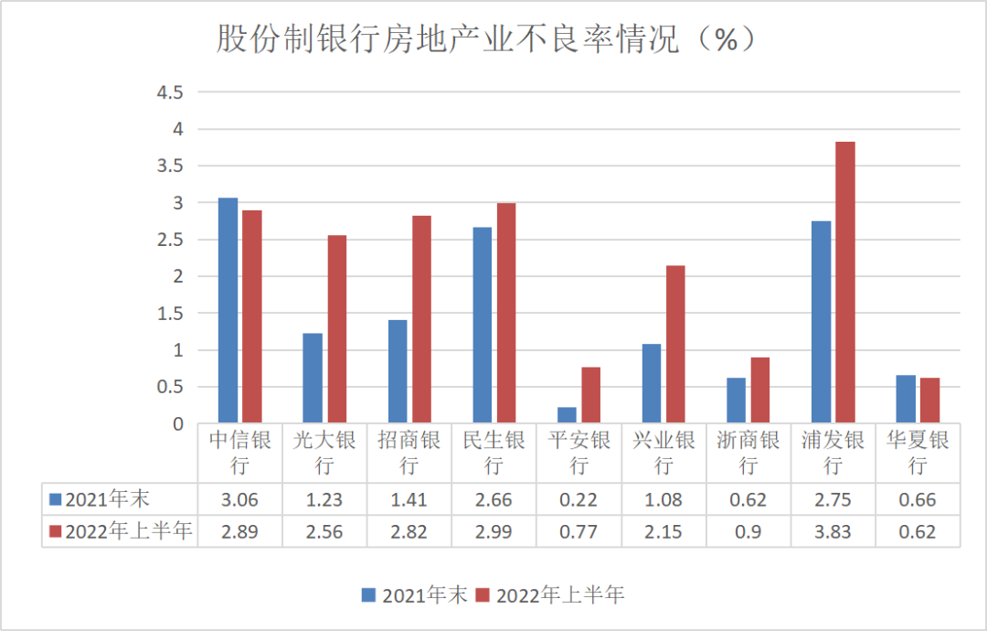 2022年上半年,在房地产业务规模占比均有所下降的情况下,除了中信银行和华夏银行之外,其余七家银行房地产业的不良率都较2021年末出现了增长。 其中招商银行增幅最大,提高了1.41个百分点,光大银行紧随其后,提高了1.33个百分点,浦发银行和兴业银行也都提高了1个百分点以上。